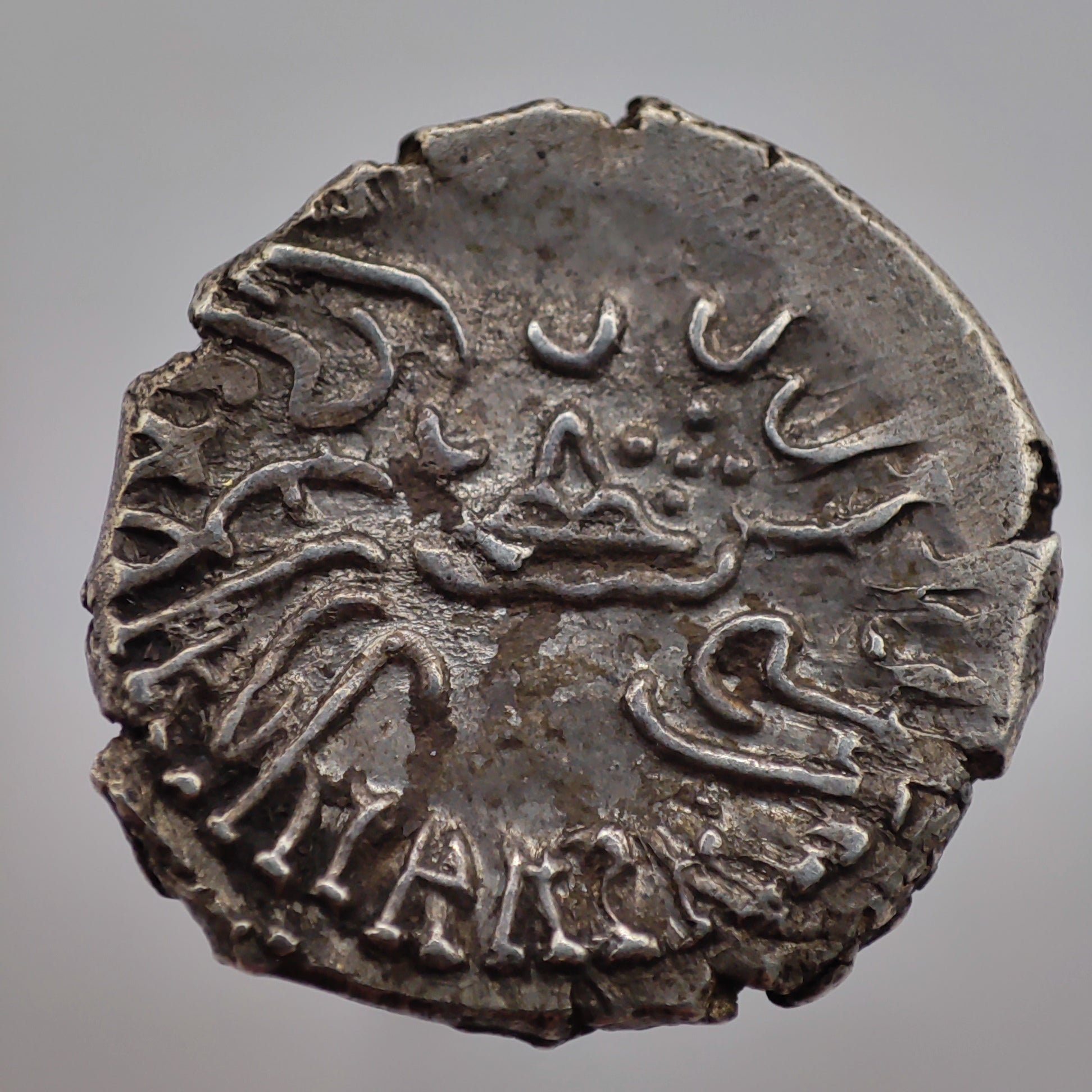 Chaitya (3-arched hill), river below, crescent moon and sun above, Brahmi legend around.