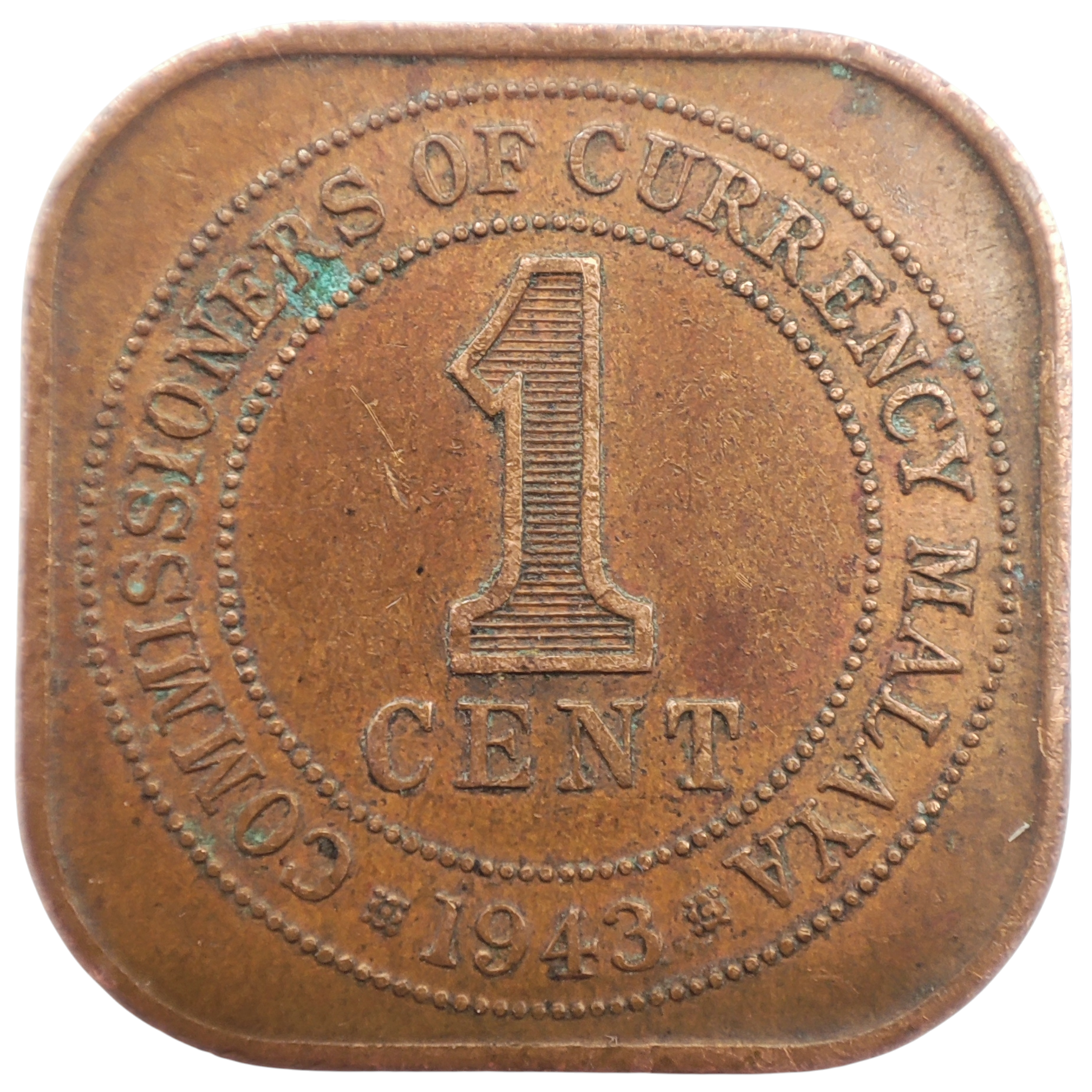 1943 Malaya 1 Cent, George VI King Emperor Commisioners of Currency