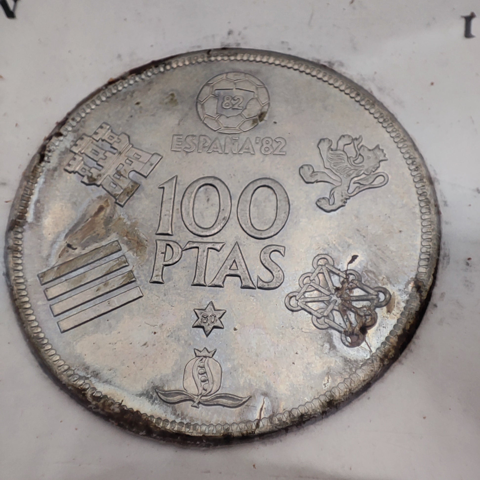 Value surrounded by 1982 FIFA World Cup logo on top and emblems of Spanish Kingdoms (Leon, Navarra, Granada, Aragon and Castile)