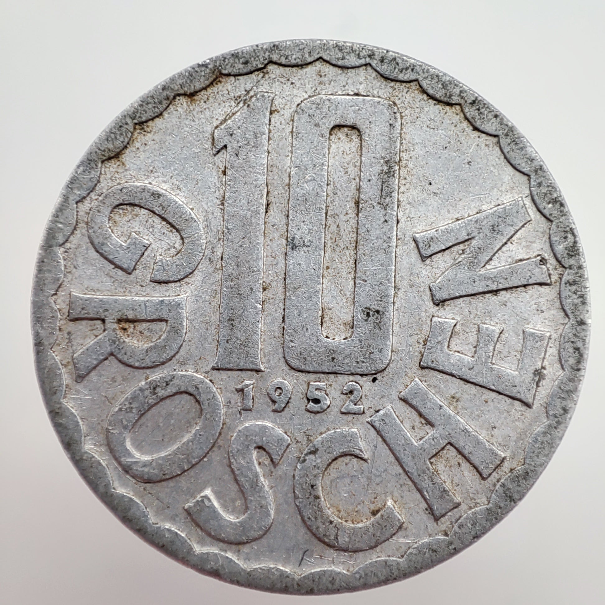 The Austrian coat of arms (the imperial eagle carrying the Austrian shield on its breast) with broken chains, which signify Austria as an independent country, and the country name as a stylized inscription, and denomination in the scalloped rim.