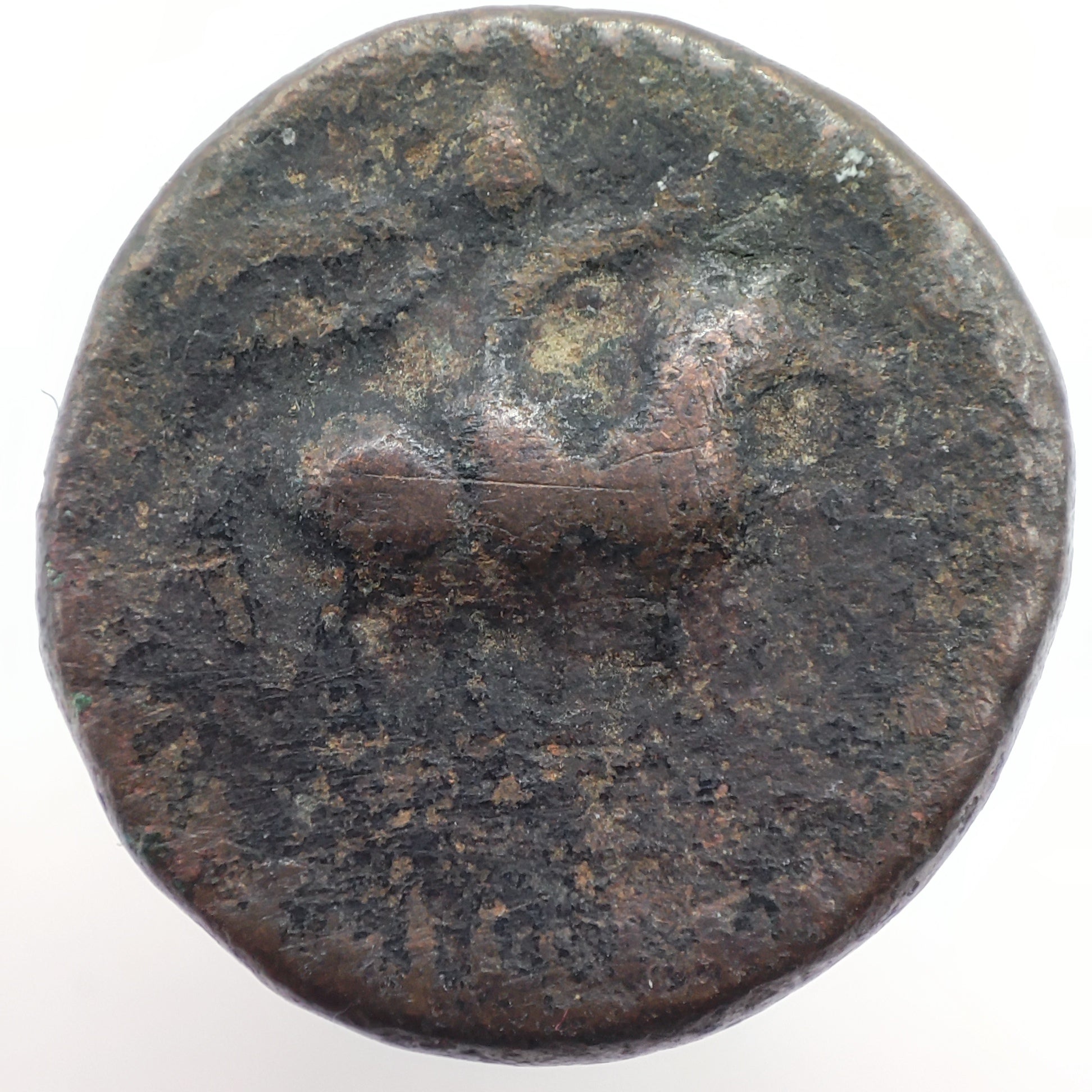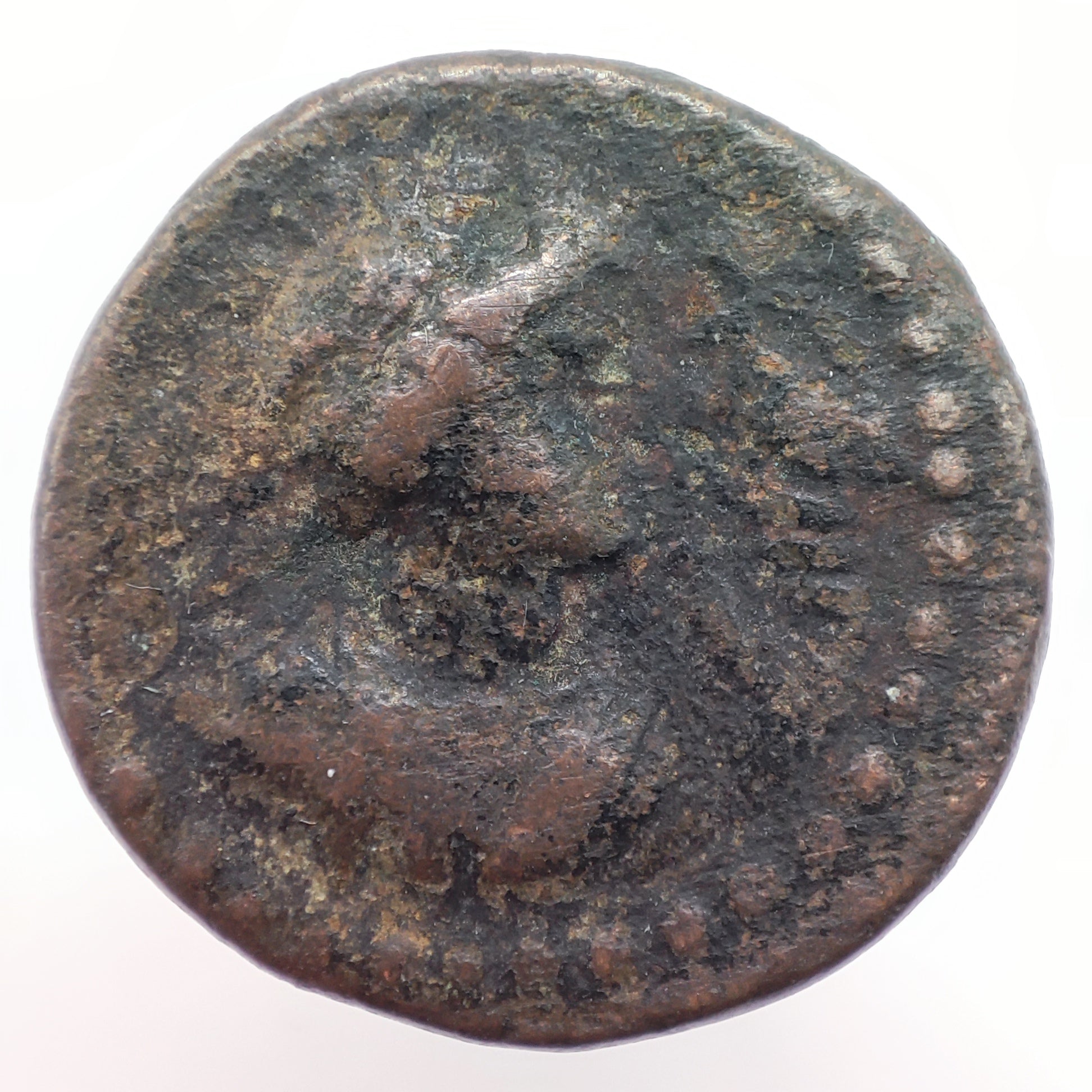 Diademed bust right, holding sceptre, Tamgha behind, all within dotted border.