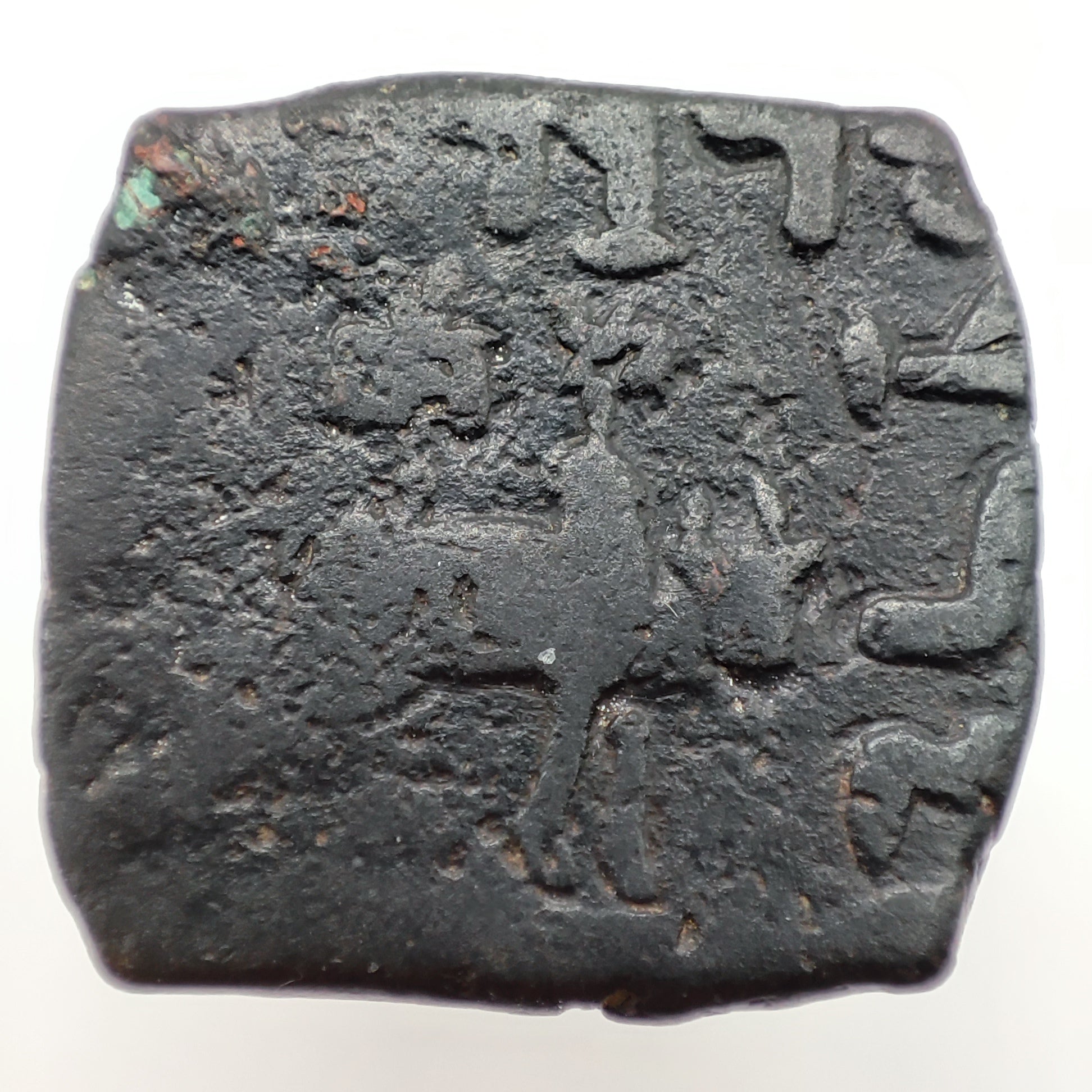 Bull standing right, monograms above, Karoshti legend around.